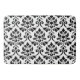 Vintage influenced leafy baroque style damask surface pattern design in black detail on a white background.