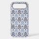 Decorative damask surface pattern design in dark and mid-blue blue detail on a pale cream color background.
