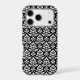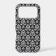 Vintage inspired decorative damask surface pattern design in white detail on a black background.