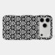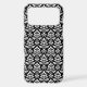 Vintage inspired decorative damask surface pattern design in white detail on a black background.