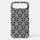 Vintage inspired decorative damask surface pattern design in white detail on a black background.