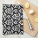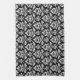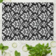 Vintage influenced leafy baroque style damask surface pattern design in white detail on a black background.