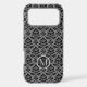 Vintage influenced leafy baroque style damask surface pattern design in black detail on a gray background, with encircled initial/letter in light gray on a transparent black circle background, which can be altered and personalized.