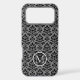 Vintage influenced leafy baroque style damask surface pattern design in black detail on a gray background, with encircled initial/letter in light gray on a transparent black circle background, which can be altered and personalized.