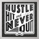 Text reads: Hustle, Hit And Never Quit, with a crossed field hockey sticks icon.