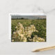 Wander through a sunny summer day in a field of blooming buckwheat on this lovely postcard. The flowers are a delicate white with a pale yellow tinge. Each has a red stamen. The green field seems to go on for acres to a tiny farm house in the distance with just the hint of blue sky. Buckwheat is an ancient crop. The first known cultivation was in southeast Asian around 6,000 B.C.