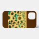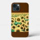 Phone case in a field of golden yellow sunflowers with chocolate brown centres and green leaves