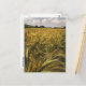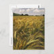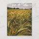 This fine art photography postcard presents a scenic summer landscape of a field of ripening gold, brown and yellow grain, almost ready to harvest. The farm buildings and barns are way in the distance. The stalks are blowing in the wind to form a lovely abstract pattern.
