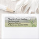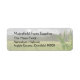An address label with a photo of a rural farming landscape in the rain with a field of maize or corn in the background and some closer maize plants in the foreground, against a stormy sky.