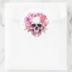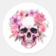 Watercolor pink skull with flowers, softness of floral elements,touch of charm.