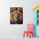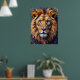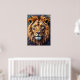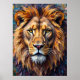 This painting is an intense, close-up portrait of a lion's head, focusing on its powerful gaze and textured mane. The artwork is rendered with a heavy impasto technique, with thick, bold brushstrokes that create a sense of raw energy and wildness. The lion's face is a striking mix of orange, brown, and golden tones, and its bright yellow eyes are piercing and captivating.