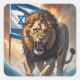 A fierce lion is roaring on a dramatic backdrop with stormy skies, ocean waves, and the Israeli flag