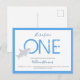 A “He’s a fierce ONE” first birthday, grey shark, postcard invitation. This postcard shows a cartoon shark with the word ONE in large letters. The colour scheme is blue, white, and grey. Simply customise the words, add this postcard invite to your cart, and celebrate this fabulous birthday.