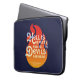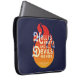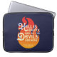 Laptop sleeve featuring the quote from William Shakespeare’s The Tempest “Hell is empty, and all the devils are here” against an orange fire on a blue background.