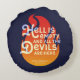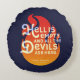 A bookish pillow featuring the quote from William Shakespeare’s The Tempest “Hell is empty, and all the devils are here” against an orange fire on a blue background