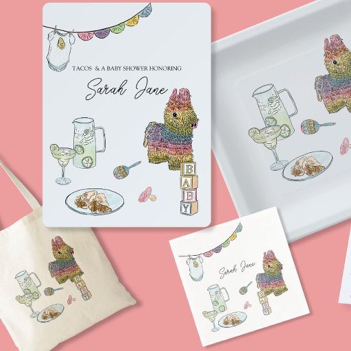 Set the stage for a fun and festive celebration with this Fiesta Baby Shower Invitation! Featuring vibrant illustrations of tacos, a colourful piñata, and refreshing margaritas, this invitation brings the perfect mix of joy and excitement to welcome the little one. The playful design captures the spirit of a lively fiesta, making it ideal for a baby shower filled with laughter, delicious food, and good company.