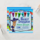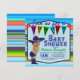 Fiesta baby shower invitation with cute baby boy wearing a dark blue sombrero outfit on a festive multi colour serape background. These adorable baby boy Mexican Fiesta baby shower invitations are easily customised for your event by simply adding your details.