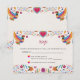 This Fiesta Colorful Flowers Botanical Spanish Wedding RSVP Card vibrant design features two colorful birds in the top corners, framing a large red heart with a glowing flame above it, evoking a sense of love and passion. Surrounding the central area are intricate floral patterns and leaves, arranged symmetrically in bright hues like pink, orange, green, and blue, inspired by traditional Mexican folk art. The overall feel is festive and romantic, with a lively composition that draws the eye to the center, making it ideal for a wedding stationery.