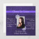 Elegant dark purple damask invitation, perfect for your daughter's Quinceañera. A lavender satin looking ribbon, at the top, says Fiesta De Quince, in white script text. A photo area is bordered by two lavender flower, with heart shaped diamonds decorating them, add your own photograph here. All the text is in white and fully customisable to suit your needs.