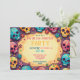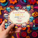 Say ¡hola! to *Fiesta en el Cráneo*, the Day of the Dead invite that’s got more personality than a sugar skull in a sombrero. With a rainbow riot of decorated calaveras, flower bursts, and party vibes that practically dance off the page, this card sets the scene for a celebration that’s equal parts remembrance and ridiculous joy. The front delivers all the party essentials—date, time, location, and costume rules—while the back is yours to personalise with RSVP info, cheeky notes, or a warning about candy-loving ancestors. It’s the ultimate way to summon your skeleton squad for a night of music, mischief, and marigold magic. BYOD: Bring Your Own Dance moves.
