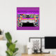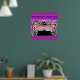 Whimsical modernistic psychedelic hippies type look at the icons of the fifties in neon colours of pinks, purples, reds, blues.