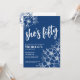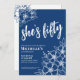 Elegant Fifty Blue 50th Birthday Party Invitation. A fun but elegant 50th birthday party invitation with girly blue and white flowers for the young at heart. A playful flower pattern frames a script typography "she's fifty" mixed with a more classic serif font. Celebrate fifty years of life with this beautiful botanical design. The fun part is you can change out ALL of the colours!! You can not only change the background colours and font, but you can change the lines for the flowers as well.