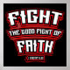 Encouraging Christian Bible verse scripture 1 Timothy 6:12 “Fight the good fight of faith” featuring sporty red bold text graphic. Spread spiritual inspiration and motivation with this faith-based message of Christian perseverance.