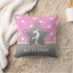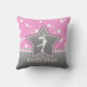 Beautiful figure skating throw pillow with a pink background covered in white stars. It has a grey star with a white silhouette, and a grey banner with a pink and white stripe. Add your name before you order! You can also use the "customise it" button to pick a different font or colour for the text!