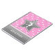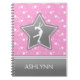 Beautiful figure skating notebook with a pink background covered in white stars. It has a grey star with a white silhouette, and a grey banner with a pink and white stripe. Add your name before you order! You can also use the "customise it" button to pick a different font or colour for the text!