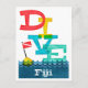 Colourful Fiji scuba design. Retro typography in inkpress style with the word "Dive", along with a scuba flag floating in the ocean.