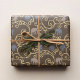 Grey and blue elephants amongst yellow filigree flourishes against a coffee brown background.