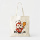 A Jollibee-inspired character holding a piece of chicken that could be chicken-joy. The character has big round eyes, a happy smile, rosy cheeks, and playful proportions. Tote Bag that has a customisable line that currently says "Bida ang Saya".