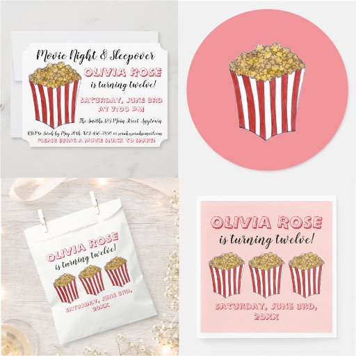 Design features an original marker illustration of a red-and-white striped carton of delicious popcorn! Ideal for a sleepover or movie night. Coordinating party designs available from this shop.