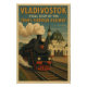 Foreground: iconic Trans-Siberian steam locomotive in classic black and red, with steam clouds billowing dramatically. The train faces forward, arriving proudly at the Vladivostok station