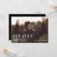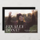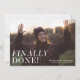 Invite guests to your party with our Finally Done graduation party invites. The fun graduation party invites feature "Finally Done!" in a modern white font overlay with the graduate's photo, name, school & graduation year on front. The back features "let's celebrate" and your party details in white against a black background.