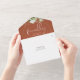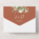 All in one postponed wedding invitation featuring botanical greenery rustic leaves falling across a gold arch enclosing elegant typography on a terracotta background. The invitation includes a perforated RSVP card that can be individually addressed or left blank for you to handwrite your guest's address details. Designed by Thisisnotme©