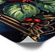 Behind them is a stunning landscape with majestic snow-capped mountains under a starry sky, illuminated by the ethereal glow of the Northern Lights. Pine trees frame the scene, reflecting in a serene body of water in the foreground. The overall composition combines natural beauty with vivid colours, creating an enchanting atmosphere. The arrangement of the berries and leaves introduces a lush, organic element to the artwork, enhancing its visual appeal.