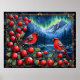 Vibrant, artistic scene featuring two red birds, likely finches, perched amidst a cluster of bright red berries. The birds have a striking blend of red and grey plumage, highlighting their presence against the rich background.