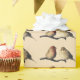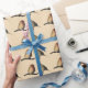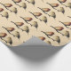 This wrapping paper features a pair of house finches perched on a branch. The male has red plumage on his head and breast. The female is tan and brown with stripes.