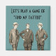 This magnet features a vintage image of three well dressed men, on a teal background, with the text, "Let's play a game of find my tattoo."
