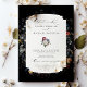 This chic acrylic invitation design features an 18th century Dutch floral still life, including white, red and gold tulips and wildflowers, on a black background with custom centre label cutout, complementary floral graphics and elegant flowing custom calligraphy.
