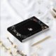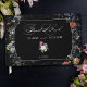 This chic foil guest book design features an 18th century Dutch floral still life, including white, red and gold tulips and wildflowers on a black background with custom centre label, complementary floral graphics and elegant flowing custom calligraphy. The back features an optional floral wreath with monogram template.