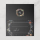 This chic place card design features an 18th century Dutch floral still life, including white, red and gold tulips and wildflowers, on a black background with custom centre label, complementary floral graphics and elegant flowing custom calligraphy. The back features an optional floral wreath with monogram template.