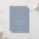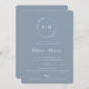 Fine art foliage, engagement party invitation. Card design features, white monogram frame with greenery accents and elegant white typography template design. Background colour of card, shown in solid dusty blue colour.