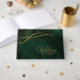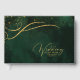 A watercolor background in shades of emerald green is topped by an abstract of fine gold lines and glittering lighting effects to create the pieces of this beautiful wedding suite. The wedding guest book shown here also features a personal message and a beautiful gradient frame to hold your initials and wedding date on the back. Search ID867 to see other pieces and colour choices for this set.