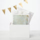 A watercolor background in shades of sage green is topped by an abstract of fine gold lines and glittering lighting effects to create the pieces of this beautiful wedding suite. The wedding favour bag shown here also features 'Thank You' calligraphy and a personal message along with the bride and groom's names and wedding date. Search ID867 to see other pieces and colour choices for this set.