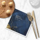 A watercolor background in shades from royal blue to navy is topped by an abstract of fine gold lines and glittering lighting effects to create the pieces of this beautiful wedding suite. The wedding paper napkin shown here also features off-centered text and a template to add your own personal message along with your names and wedding date. Search ID867 to see other pieces and color choices for this set.