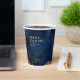 A watercolor background in shades from royal blue to navy is topped by an abstract of fine gold lines and glittering lighting effects to create the pieces of this beautiful wedding suite. The wedding paper cup shown here also features off-centred text and a template to hold the bride and groom's names, wedding date and a thank you message for your guests. Search ID867 to see other pieces and colour choices for this set.