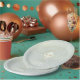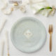 A watercolor background in shades of sage green is topped by an abstract of fine gold lines and glittering lighting effects to create the pieces of this beautiful wedding suite. The wedding paper plate shown here also features a gradient, diamond-shaped frame to hold the bride and groom's initials and wedding date. Easily add a personal thank you message using the provided template. Search ID867 to see other pieces and colour choices for this set.