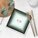 A watercolor background in shades of emerald green is topped by an abstract of fine gold lines and glittering lighting effects to create the pieces of this beautiful wedding suite. The wedding paper napkin shown here also features a gradient, gold-edged frame to hold the bride and groom's initials and wedding date. Search ID867 to see other pieces and colour choices for this set.